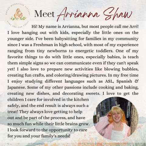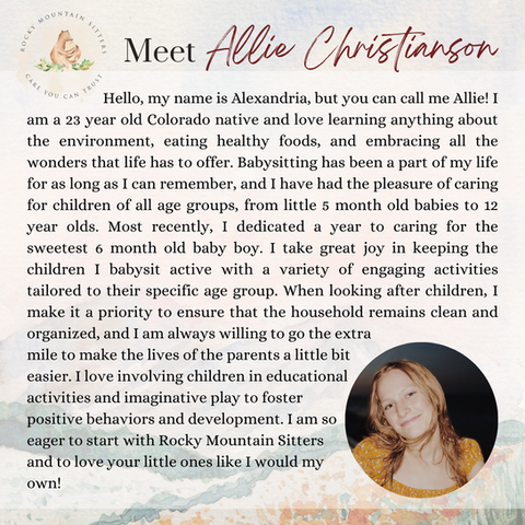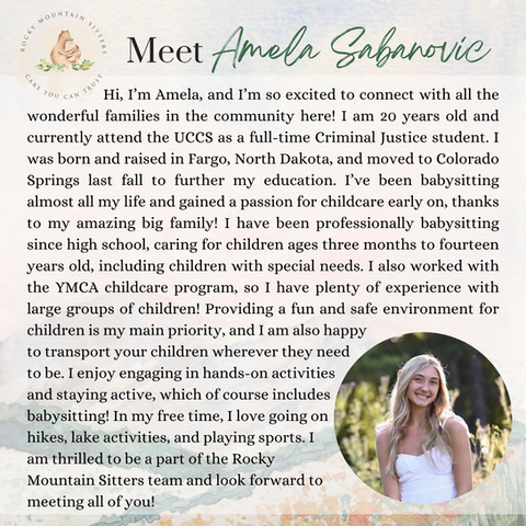 Hello there, my name is Rebecca! I want to extend a warm welcome to Rocky Mountain Sitters. I've had a genuine passion for working with children for as long as I can remember, and I can't imagine a life where I am not working with or caring for them. I started babysitting as soon as I was old enough and founded my first childcare company while studying to become a paramedic in Virginia. I was able to make lasting connections with over 2,000 families in my community while managing 50 incredible local sitters and nannies. In January of 2023 I sold Tidewater Tots Childcare to one of the company managers before embarking on a three-day journey to Colorado Springs to be with family. Since relocating here, I have had the pleasure of connecting with numerous wonderful families and discovered they were still struggling to find trustworthy sitters when I was unavailable. This inspired me to establish Rocky Mountain Sitters! My goal is to be a valuable and reliable resource for families in my community, providing parents with peace of mind while delivering exceptional, safe, and enjoyable care for their children.